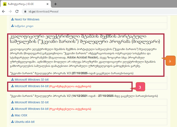 აპლიკაციაზე დაწკაპუნების შემდეგ გამოჩნდება ინფორმაცია პროგრამის შესახებ (ა) და თქვენი სისტემისთვის რეკომენდირებული პროგრამის საინსატალაციო ვერსია თავად მოინიშნება - გამოვა მითითება [რეკომენდებულია თქვენთვის] (3), პროგრამის ჩამოსატვირთად დააჭირეთ თქვენი სისტემისთვის რეკომენდირებულ პროგრამის საინსატალაციო ვერსიას (3).