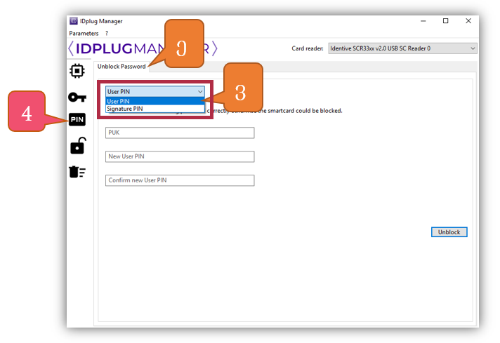 შტამპის შუალედური პროგრამის IDplug Manager-ის  საშუალებით შესაძლებელია შტამპის ბარათის დაბლოკილი ხელმოწერის Signature PIN კოდის განბლოკვა. ამ პროცედურისთვის დაგჭირდებათ შტამპის ბარათის ხელმოწერის Signature PUK კოდი, რომელიც შტამპის ბარათთან ერთად კონვერტით გადმოგეცათ.