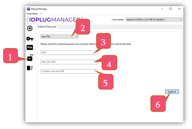 შტამპის შუალედური პროგრამის IDplug Manager-ის  საშუალებით შესაძლებელია შტამპის ბარათის დაბლოკილი ავთენტიფიკაციის User PIN კოდის განბლოკვა. ამ პროცედურისთვის დაგჭირდებათ შტამპის ბარათის ავთენტიფიკაციის User PUK კოდი, რომელიც შტამპის ბარათთან ერთად კონვერტით გადმოგეცათ.