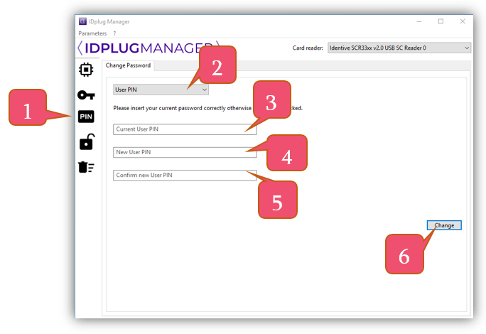 შტამპის შუალედური პროგრამის IDplug Manager-ის  საშუალებით შესაძლებელია შტამპის ბარათის ავთენტიფიკაციის User PIN კოდის შეცვლა.
