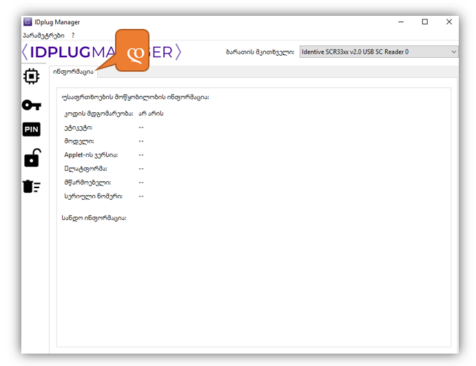 ამისათვის შტამპის ბარათი განათავსეთ ბარათის წამკითხველ მოწყობილობაში და გაუშვით შტამპის შუალედური პროგრამა IDplug Manager-.