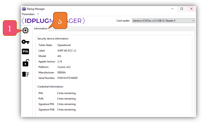 მასზე დაწკაპებით გაიხსნება IDplug Manager პროგრამის საწყისი ფანჯარა, სადაც შესაძლებელია შტამპის ბარათის შესახებ ინფორმაციის მიღება და მასზე სხვადასხვა მოქმედებების განხორციელება.