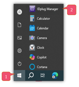 შტამპის შუალედური პროგრამის გასაშვებად მოათავსეთ შტამპის ბარათი წამკითხველში და გახსენით Windows-ის პროგრამების ჩამონათვალი, დააჭირეთ Start- (1) მოძებნეთ  IDplug Manager (2).